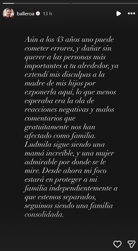Por lo mismo destacó que "Ludmila sigue siendo una mamá increíble y una mujer admirable por donde se le mire. Desde ahora mi foco estará en proteger a mi familia independientemente a que estemos separados, seguidos siendo una familia consolidada". De esta manera Álvaro Ballero apagó el fuego ante una situación que ya comenzaba a afectar a su ex.