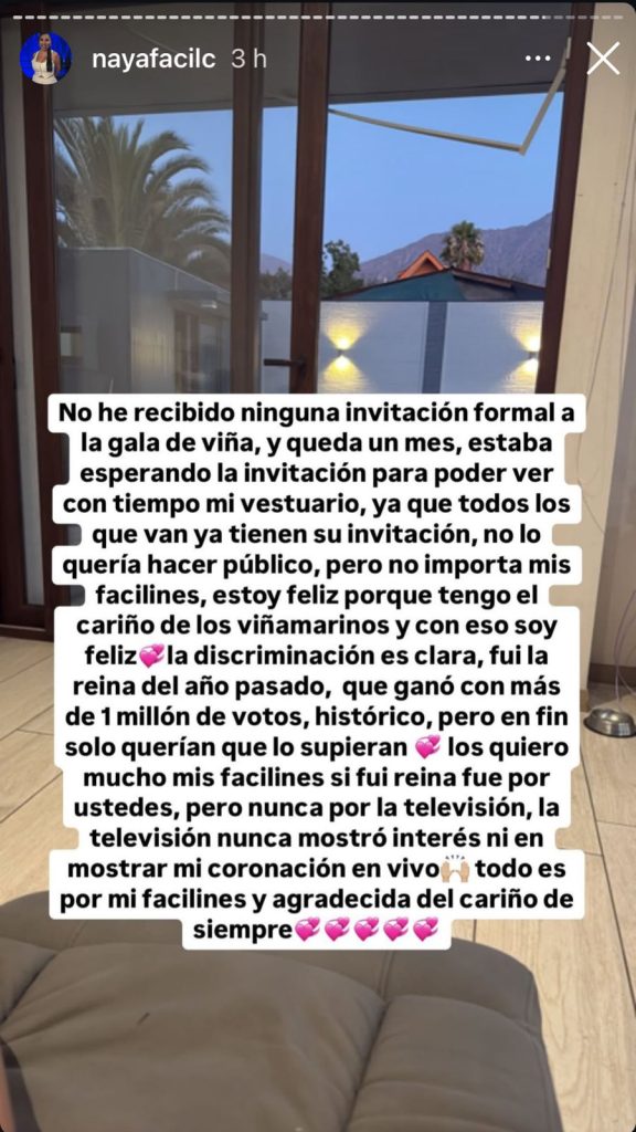"No he recibido ninguna invitación formal a la gala de viña, y queda un mes, estaba esperando la invitación para poder ver con tiempo mi vestuario, ya que todos los que van ya tienen su invitación, no lo quería hacer público, pero no importa mis facilines, estoy feliz porque tengo el cariño de los viñamarinos", escribió Naya en sus redes sociales.