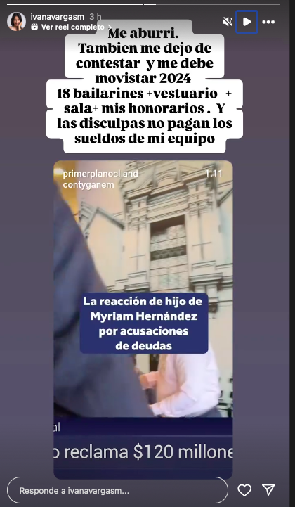 "Me aburri. También me dejó de contestar y me debe Movistar 2024, 18 bailarines, vestuario, sala, y mis honorarios. Y las disculpas no pagan los sueldos de mi equipo," acotó la Ivana sobre su caso.