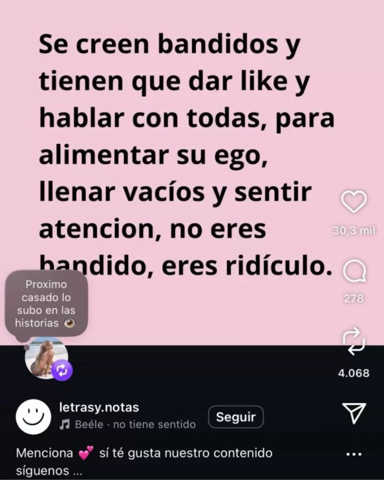 “Se creen bandidos y tienen que dar like y hablar con todas para alimentar su ego, llenar vacíos y sentir atención. No eres bandido, eres ridículo”, decía la publicación que Coté López reposteó en sus redes. A continuación, escribió: “Próximo casado lo subo en las historias”, dejando claro que podría exponer a quienes le escriban siendo comprometidos.