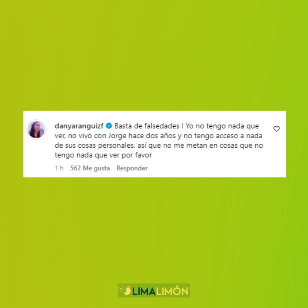 Palabras a las que Daniela Aránguiz respondió diciendo, "Basta de falsedades! Yo no tengo nada que ver, no vivo con Jorge hace dos años y no tengo acceso a nada de sus cosas personales, así que no me metan en cosas que no tengo nada que ver por favor".
