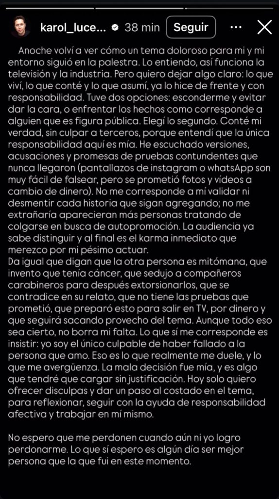Tras todo esto, durante las últimas horas de este lunes Karol Lucero compartió una nueva historia en su cuenta de Instagram refiriéndose al tema. Así, aseguró que entiende el hecho de que su polémica siga en la palestra, pues "así funciona la televisión y la industria. Pero quiero dejar algo claro: lo que viví, lo que conté y lo que asumí, ya lo hice de frente y con responsabilidad".