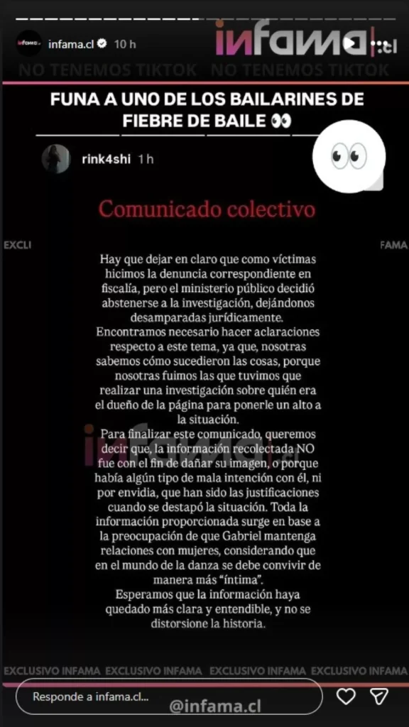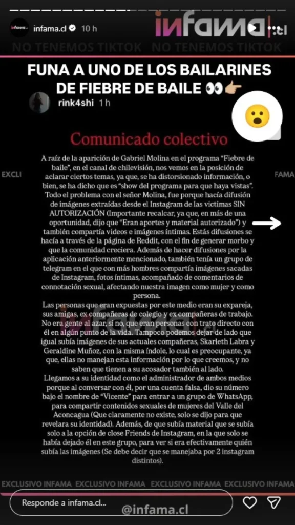Fue la cuenta Infama que reveló en primera instancia imágenes del comunicado colectivo que compartieron las personas que habrían sido víctimas de Gabriel Molina. "Todo el problema con el señor Molina fue porque hacía difusión de imágenes extraídas desde el Instagram de las víctimas sin autorización (importante recalcar, ya que en más de una oportunidad dijo que 'eran aportes y material autorizado', y también compartía videos e imágenes íntimas", señalan.