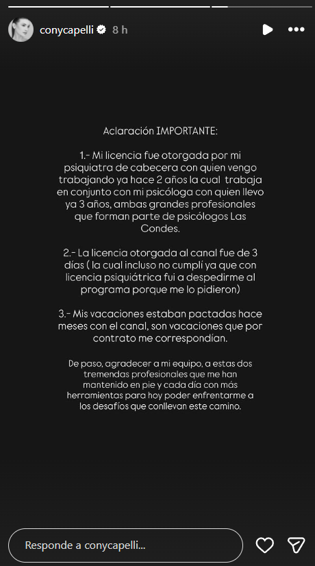 En esa línea Cony Capelli además hizo hincapié en que "la licencia otorgada al canal fue de 3 días (la cual incluso no cumplí, ya que con licencia psiquiátrica fui a despedirme al programa porque me lo pidieron). 3.- Mis vacaciones estaban pactadas hace meses con el canal, son vacaciones que pro contrato me correspondían".