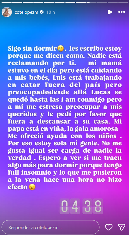 "Por eso estoy sola mi gente. No me gusta igual ser carga de nadie la verdad. Espero a ver si me traen algo más para dormir porque tengo full insomnio y lo que me pusieron a la vena hace una hora no hizo efecto", sentenció la figura, que ya horas después dijo que este preciso jueves le darían el alta, por lo que finalmente podrá volver a su hogar.