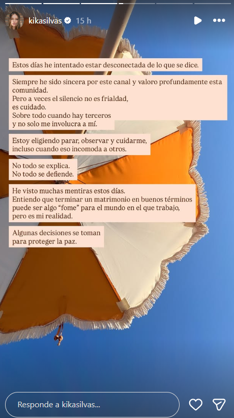 Pues bien, con todo lo que se ha dicho en los últimos días, Kika Silva expresó su sentir en las historias de su cuenta de Instagram. Ahí compartió una foto donde escribió: "Estos días he intentado estar desconectada de lo que se dice. Siempre he sido sincera por este canal y valoro profundamente esta comunidad".