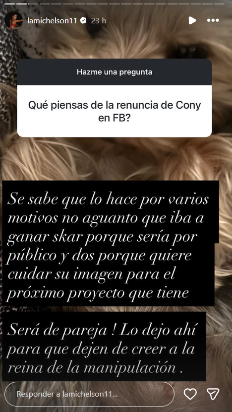Y Nacha Michelson salió al paso opinando sobre el tema. Fue en una ronda de preguntas y respuestas en sus redes sociales donde le consultaron qué le parecía esto. Ahí, ella afirmó que todo habría sido tanto por proyectos de Cony Capelli, como por el temor de perder ante otra de las participantes fuertes de la competencia, Skarleth Labra, que finalmente se coronó como ganadora.