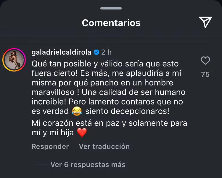 "¡Una calidad de ser humano increíble! Pero lamento contaros que no es verdad. ¡Siento decepcionaros!" Para finalizar, Gala Caldirola dejó claro que, en este momento, no está interesada en iniciar una nueva relación sentimental. "Mi corazón está en paz y solamente para mí y mi hija", afirmó, subrayando que su prioridad es su bienestar personal y el de su hija.