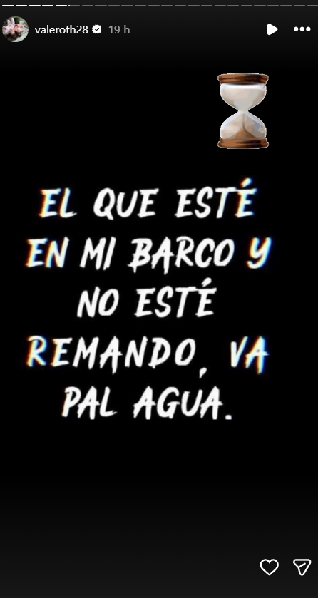 Por otra parte durante la jornada llamó la atención una historia que compartió Vale Roth en las historias de su cuenta de Instagram, donde habla precisamente sobre sacar de su vida a las personas que no aportan. "El que esté en mi barco y no esté remando, va pal agua", dicta el mensaje que compartió en su plataforma.