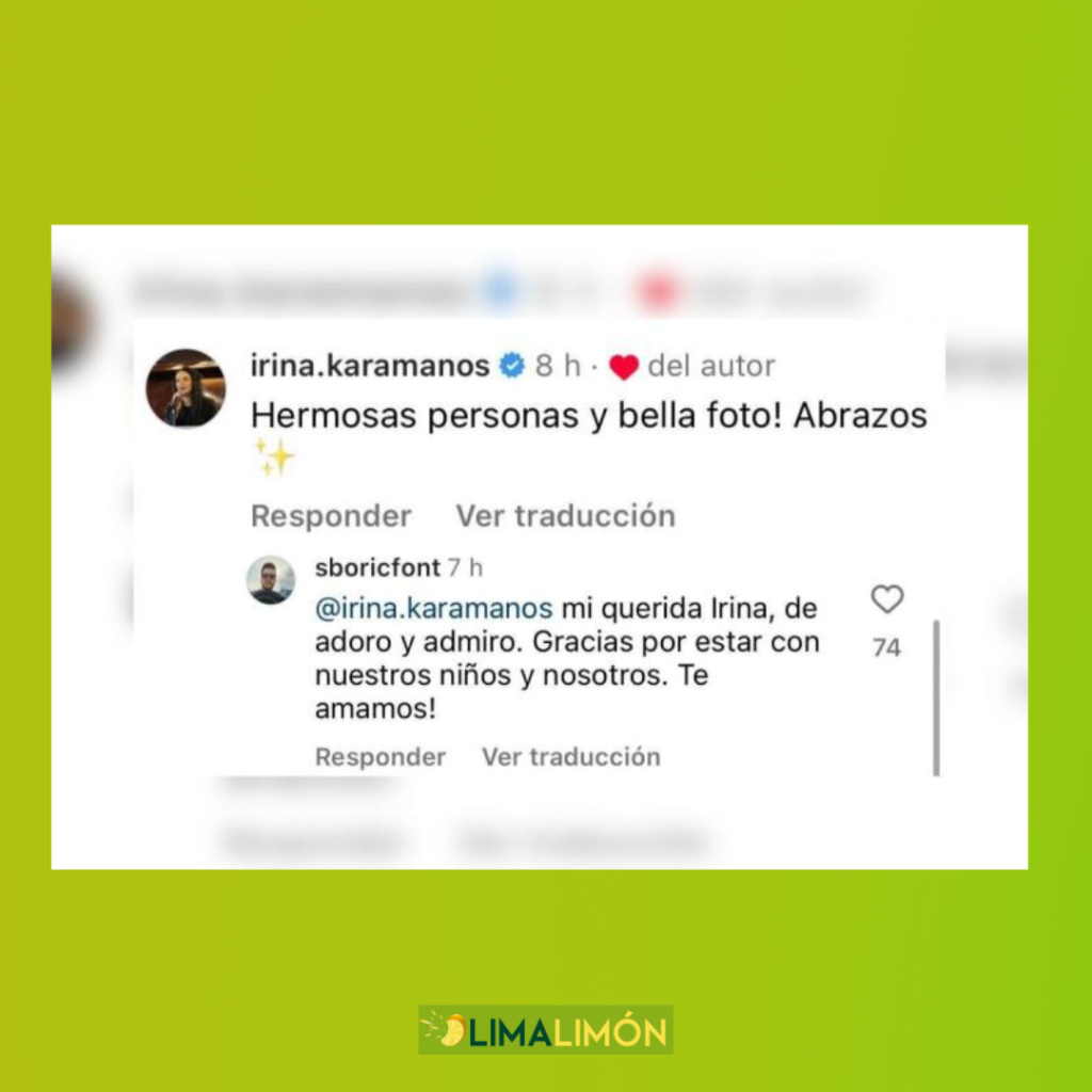 Un detalle no menor de la publicación que realizó Simón Boric, es que esta recibió el comentario de Irina Karamanos, quien escribió, "Hermosas personas y bella foto. Abrazos”. Y su ex cuñado le respondió, "Mi querida Irina, te adoro y admiro. Gracias por estar con nuestros niños y nosotros. Te amamos”.
