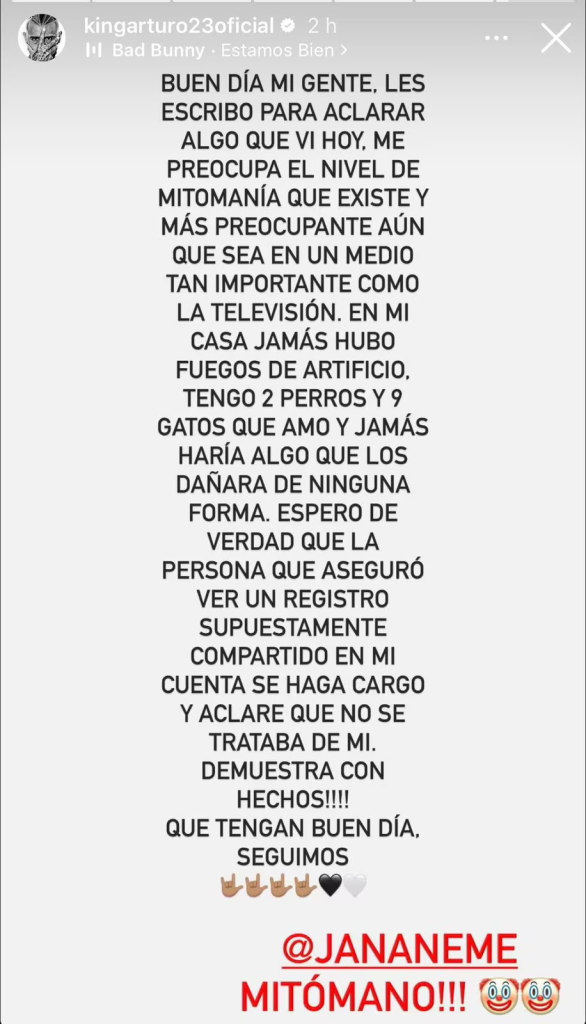 Neme explicó que el video en cuestión, el cual se viralizó durante el fin de semana, no era actual y que cometió un error al asumir su veracidad sin corroborar los hechos. "Hablé con Arturo, y me explicó que evita los fuegos artificiales por sus mascotas. Le dije que haría una aclaración en el programa porque tiene razón", admitió el periodista.