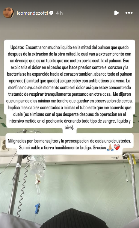 Y ahí no quedó la cosa, pues más tarde Leo Méndez contó que "encontraron mucho líquido en la mitad del pulmón que me quedó después de la extracción de la otra mitad, lo cual van a extraer pronto con drenaje ", que es lo que explicaría el dolor tan intenso que siente. Pero además le informaron que "la bacteria se ha esparcido hacia el corazón también, abarcó todo el pulmón operado (la mitad que quedó)".