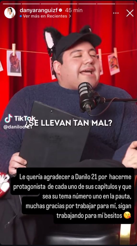 Sobre este video, la panelista de Sígueme escribió a modo de agradecimiento, afirmando que es la figura que le hace la pauta de contenidos al comunicador y asumiendo que, en consecuencia, este trabaja para ella. "Le quería agradecer a Danilo 21 por hacerme protagonista de cada uno de sus capítulos y que sea su tema número uno en la pauta", sostuvo.