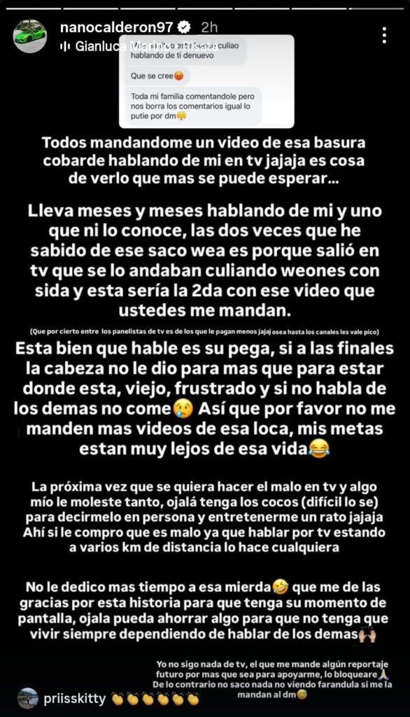Y estos dichos le comenzaron a llegar directamente a sus mensajes a Nano Calderón, por lo que durante el fin de semana compartió una historia en su cuenta de Instagram donde señaló: "Todos mandándome un video de esa basura cobarde hablando de mi en TV jaja. Es cosa de verlo, qué más se puede esperar", dijo de entrada.