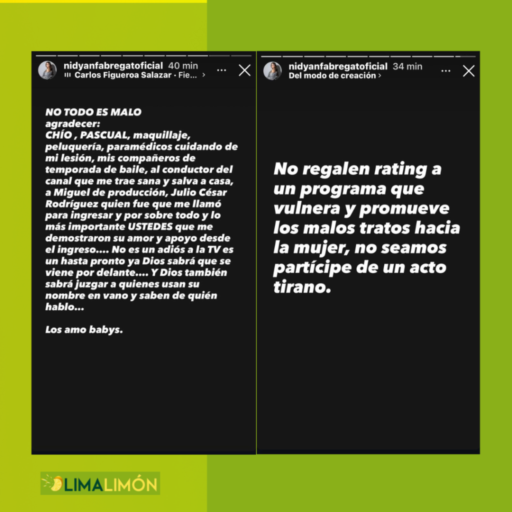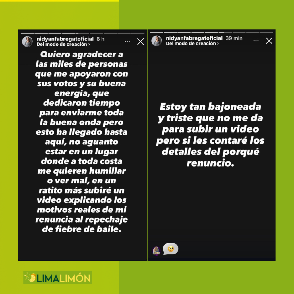 La noche de este lunes, Nidyan Fabregat regresó a la pista de baile como parte del repechaje, recibiendo el tercer lugar de las preferencias del público para volver al espacio televisivo; debía presentarse este martes por la noche, sin embargo horas antes anunció su renuncia a Fiebre de baile por redes sociales.
