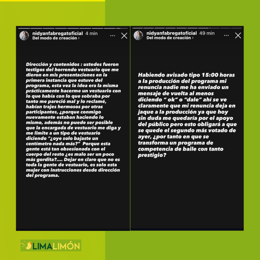 Finalmente, Nidyan Fabregat se lanzó contra el área de dirección y contenidos, asegurando que le hicieron un vestuario prácticamente "con lo que sobrara" y que hicieron caso omiso a su renuncia, a tal punto que no recibió ni un "ok" o un "dale" como respuesta.