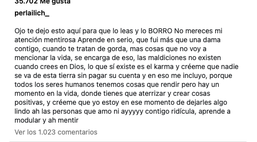 En otra publicación, Perla agregó que “todos tenemos cuentas pendientes en la vida, pero es momento de crear cosas positivas. Estoy enfocada en dejar un legado bonito para las personas que amo. Ni ahí contigo, ridícula, aprende a modular... ah, y a mentir”.