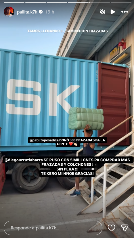 Pues bien, dentro de eso contó que necesitaban comprar carpas para las familias que se quedan en sus terrenos cuidando lo poco que les quedó. Y si bien en un inicio Pailita dijo que aportaría 300 carpas, rápidamente se fueron sumando otras personas. Pancho Saavedra, Kel Calderón, Gino Mella, Diego González, Lucky Brown, Otakin y Juan Pablo Saez, ofrecieron muchas más, sumando un total de 1.750 carpas.