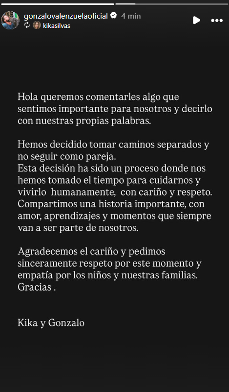 Ante esto, la expareja aprovechó de hacer un llamado, haciendo alusión a la historia que formaron y el vínculo que llegó a involucrar a sus familiares e hijos del actor. "Agradecemos el cariño y pedimos sinceramente respeto por este momento y empatía por los niños y nuestras familias. Gracias. Kika y Gonzalo", cerraron.