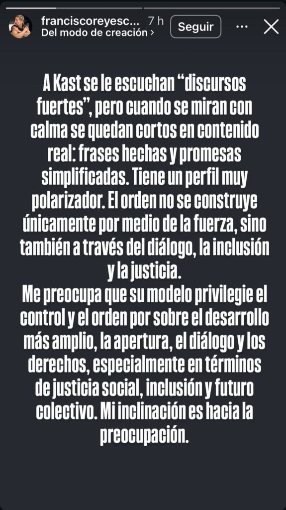 El participante de Fiebre de baile adelantó que sabía perfectamente que sus palabras gatillarían críticas y mensajes de odio, especialmente por apuntar directamente al candidato del Partido Republicano. En sus historias de Instagram, el actor partió sin rodeos: "A Kast se le escuchan 'discursos fuertes', pero cuando se miran con calma, se quedan cortos en contenido real: frases hechas y promesas simplificadas".