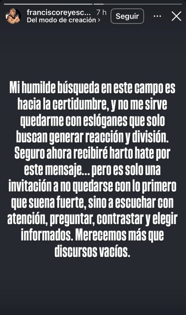 Y, para cerrar, lanzó una invitación directa a sus seguidores: "Seguro ahora recibiré harto hate por este mensaje, pero es solo una invitación a no quedarse con lo primero que suena fuerte. Sino a escuchar con atención, preguntar, contrastar y elegir informados. Merecemos más que discursos vacíos".