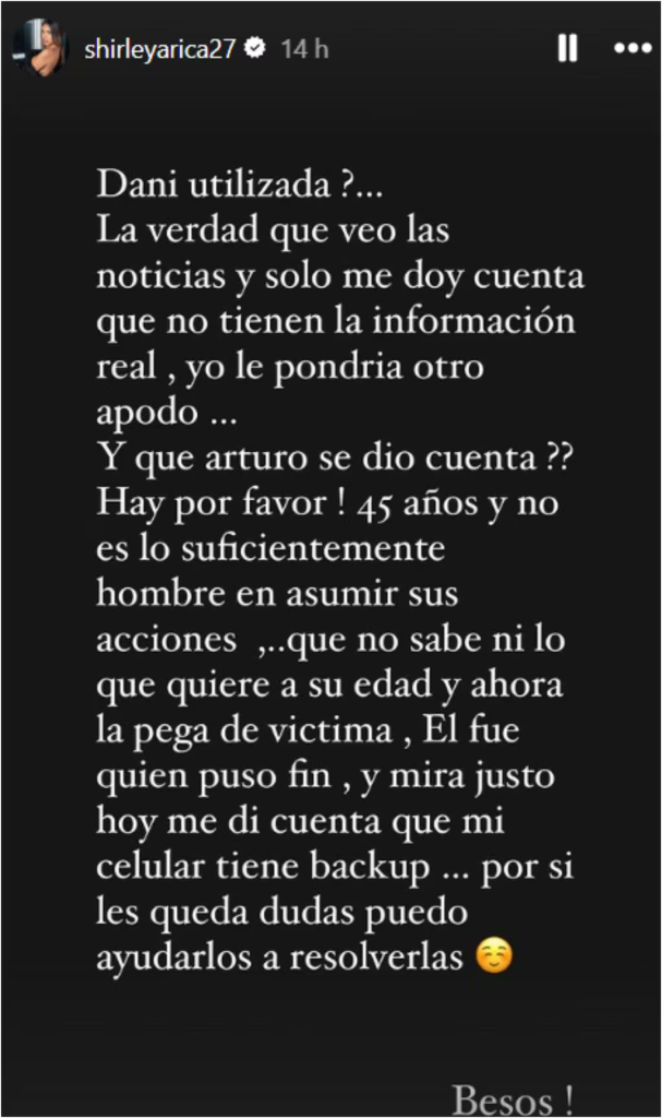 La respuesta de Shirley no se hizo esperar y utilizó su cuenta de Instagram para expresar su descontento. “La verdad es que yo veo las noticias y sólo me doy cuenta que no tienen la información real”, escribió. Sin mencionar directamente a Dani, Shirley cuestionó la veracidad de sus afirmaciones y sugirió que hay mucho más detrás de las apariencias. “Yo le podría poner otro apodo (adjetivo)...”, dejó entrever sin profundizar más en sus palabras.