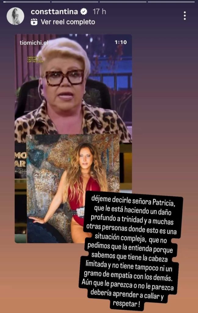 Al escuchar estas palabras que tantas críticas han encendido hacia Patricia Maldonado, Tanza Varela compartió un registro en su cuenta de Instagram donde señala: "Déjeme decirle señora Patricia, que le está haciendo un daño profundo a Trinidad y a muchas otras personas donde esto es una situación compleja, que no pedimos que la entienda porque sabemos que tiene la cabeza limitada y no tiene tampoco ni un gramo de empatía con los demás".